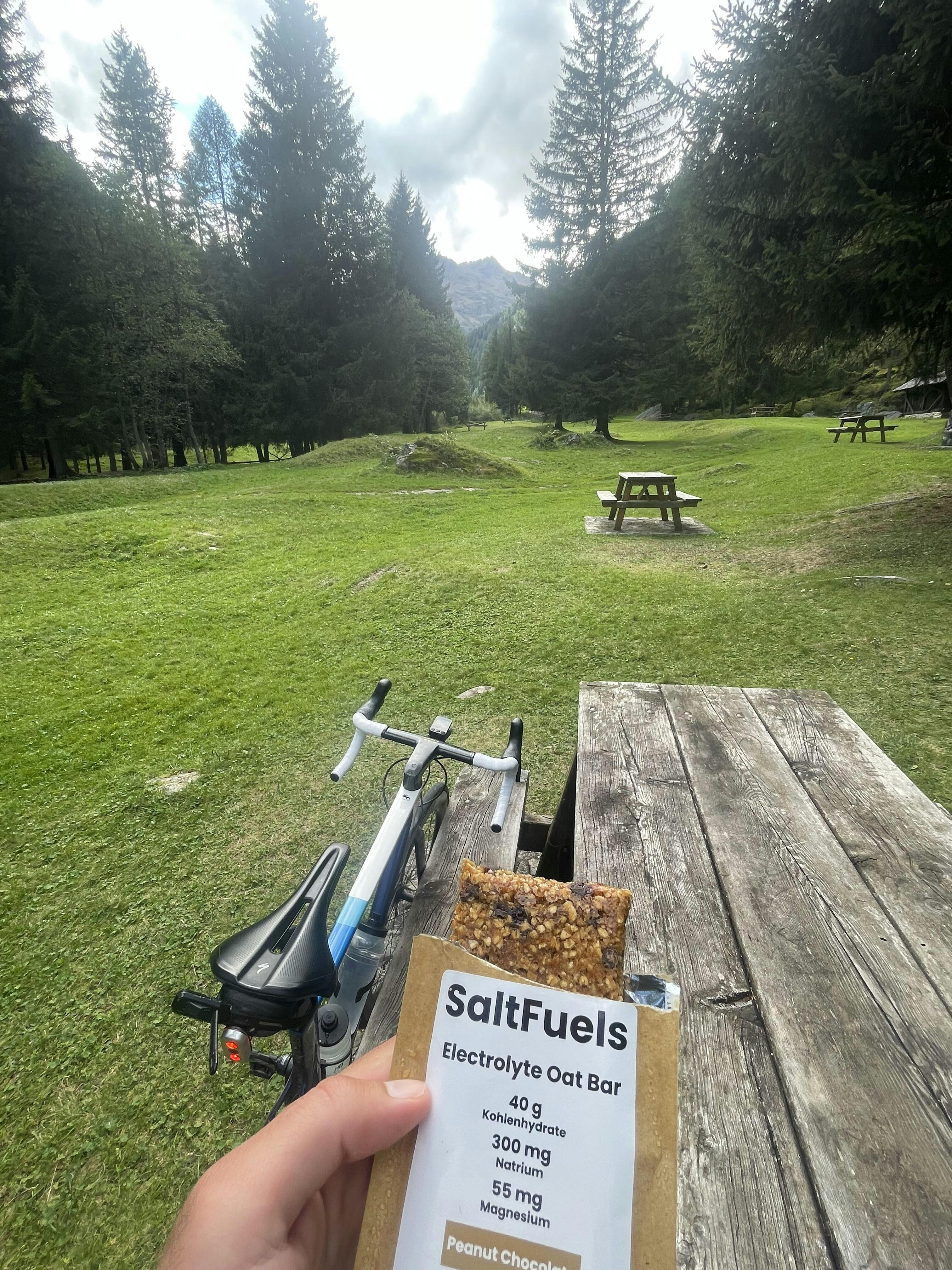 Die SaltFuels Electrolyte Oat Bar ist dein idealer Riegel bei langen Radfahrten, Wanderungen oder Skitouren.
