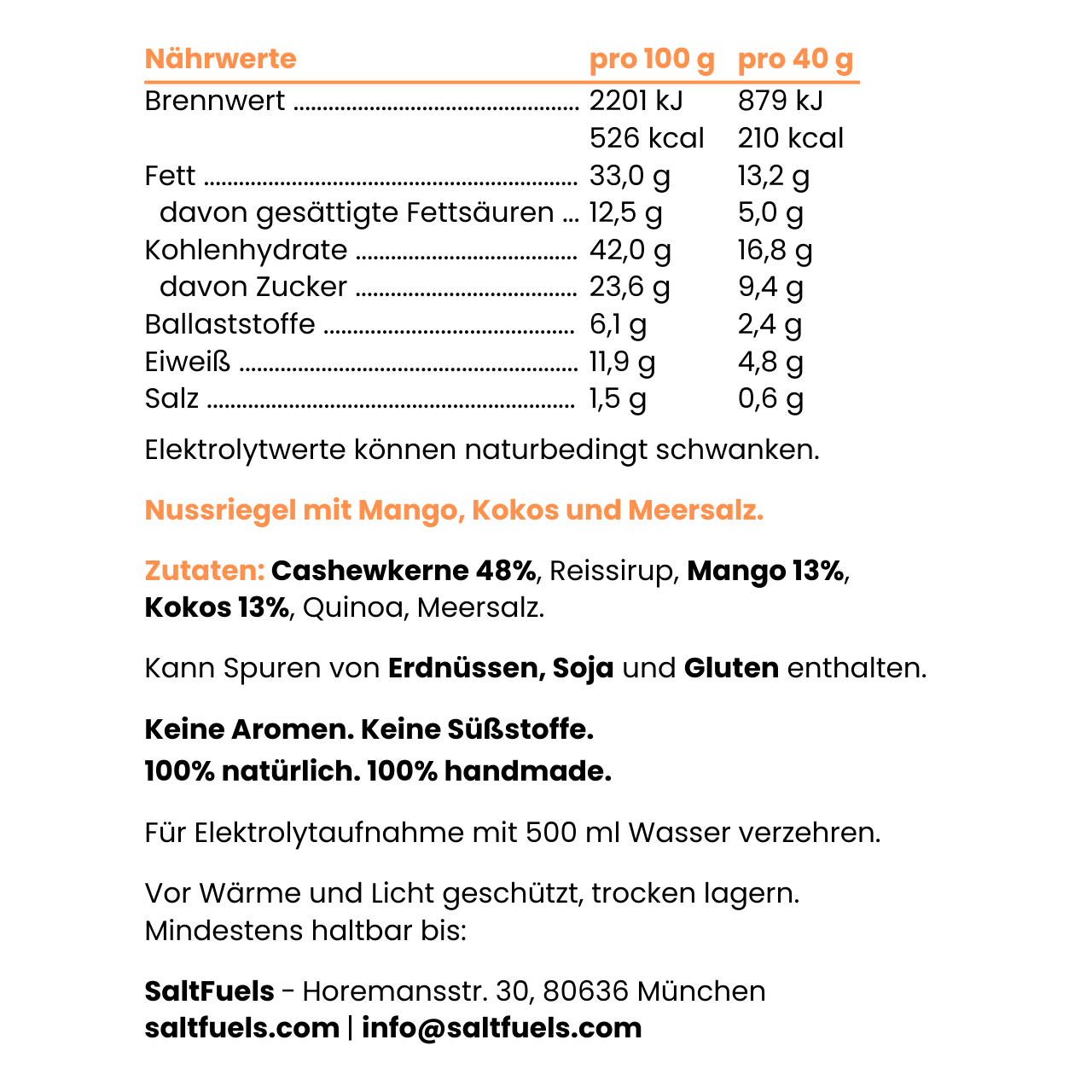 - Über 800 mg Elektrolyte → aus Nüssen, Früchten und Meersalz